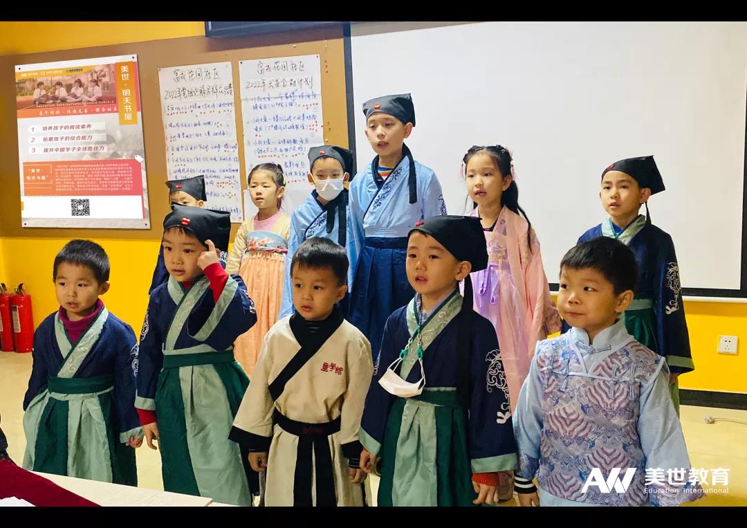 活动现场热闹非凡,美世教育的老师与恩派公益的志愿者,邀约社区16组家庭共同参与活动,妈妈志愿者带领孩子们一起穿上汉服,共读国学经典,表演国学片段和朗诵文字,并阅读儿童文学著作,体会国学精髓,让孩子们沉浸式的感受中国传统文化的魅力,让他们从小爱上国学,爱上阅读,培养爱国热情。