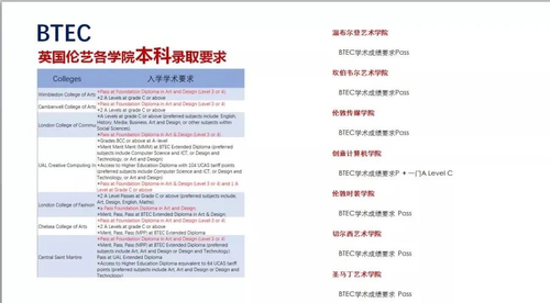 伦艺各个学院对BTEC的成绩要求如下: