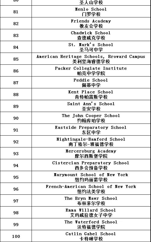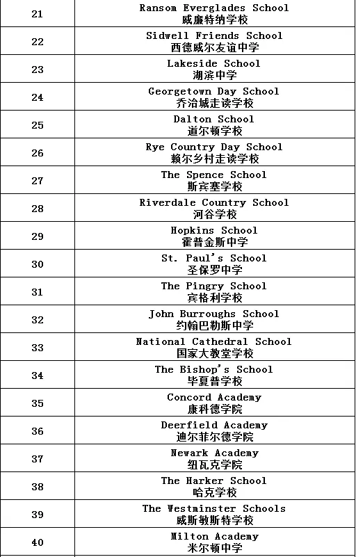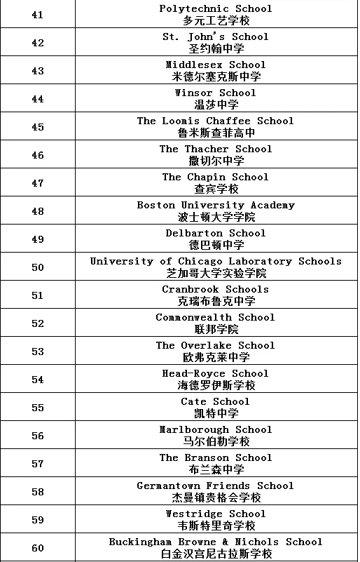 菲利普斯埃克塞特中学 (Phillips Exeter Academy) 位居第2名, 霍奇基斯中学 (Hotchkiss School) 从第17名升至第5名,劳伦斯威尔 (Lawrenceville School) 从第10名跌至16名。