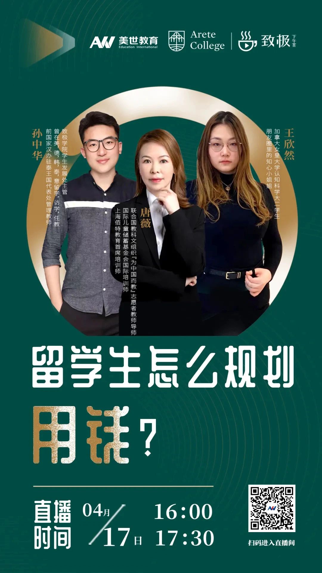 4月17日(周六)下午16:00-17:30,致极学院学生发展处主管——孙中华与国际儿童储蓄基金会国家培训师——唐薇,以及加拿大女皇大学学生——王欣然一起为大家带来《留学生怎么规划用钱》。